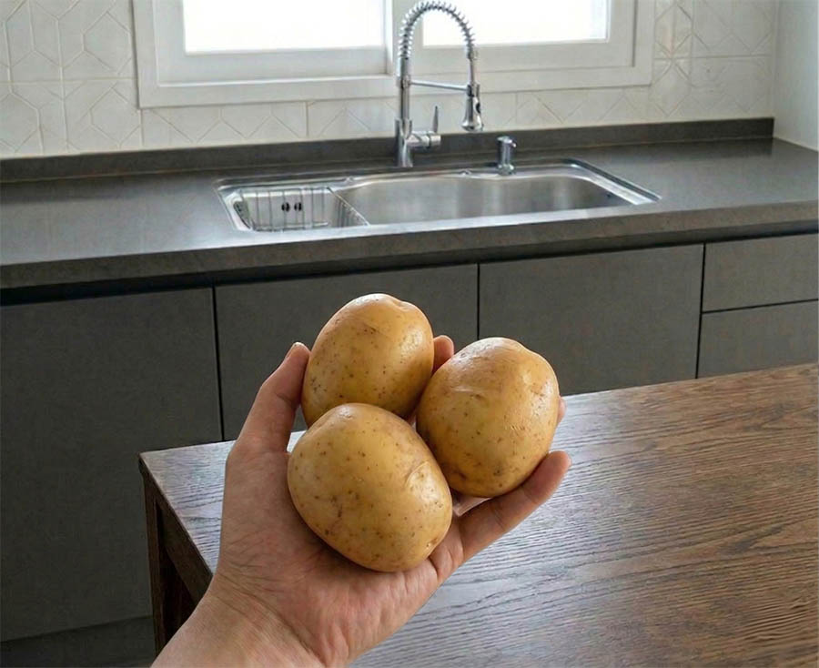 싱크대 아래는 습기와 온도가 높은 환경이라 감자가 쉽게 물러지고 곰팡이가 생기기 좋은 환경입니다. 또한 통풍이 안 되면 감자의 싹이 나거나 독성 성분이 생길 수 있습니다.