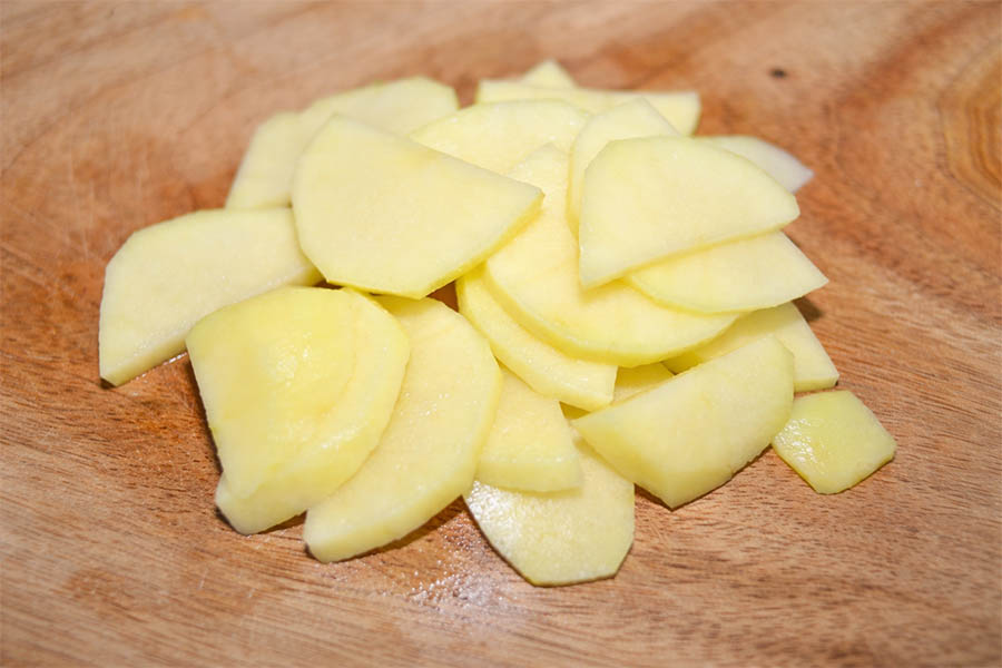 감자는 너무 두껍지 않게 나박 썰어 둡니다. 감자는 해장국에 구수함과 단맛을 더하는 핵심 재료입니다.