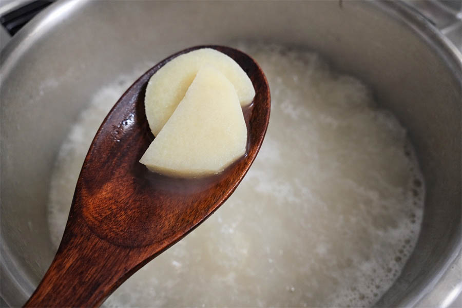 감자를 먼저 볶아야 쌀뜨물과 만나도 쉽게 부서지지 않습니다.