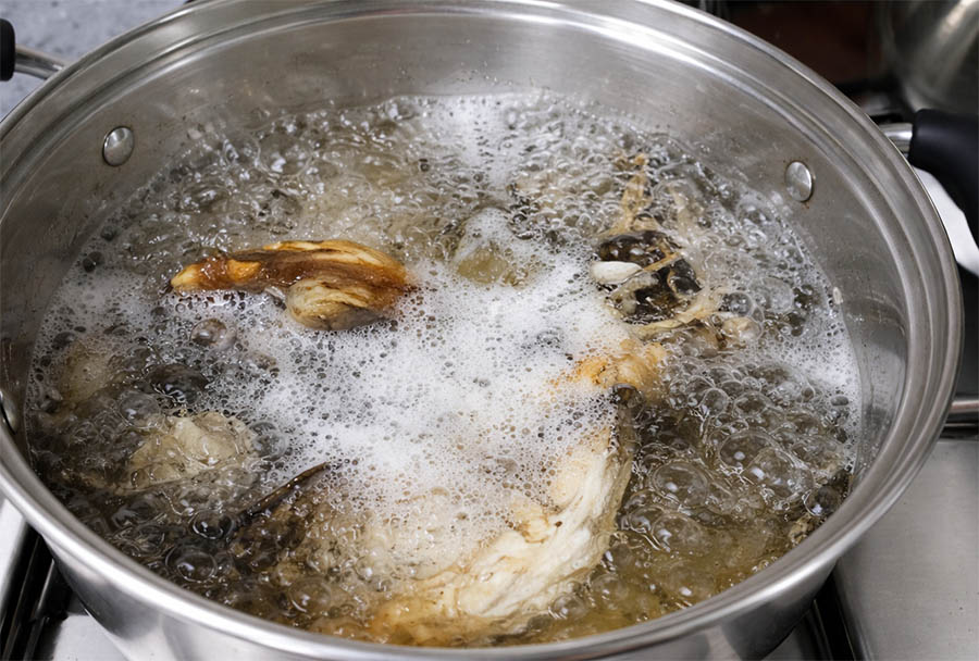 완성된 육수는 체에 한 번, 면보나 주머니에 한 번 더 걸러 머리·뼈·다시마는 모두 제거합니다.