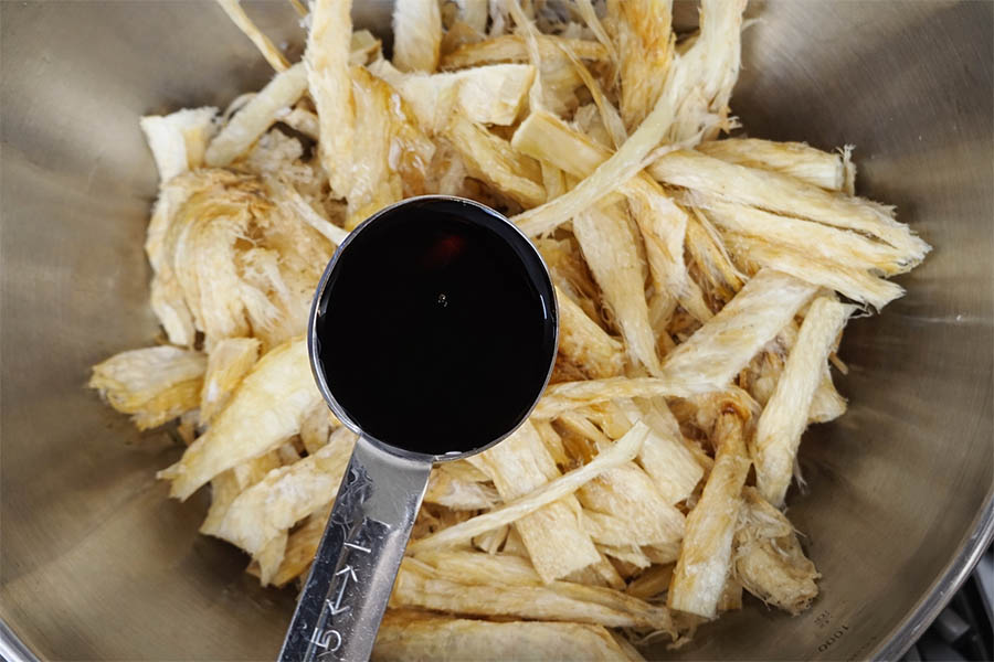 황태채는 조선간장으로 살짝 밑간해 둡니다. 강하게 간하지 말고, 밑바탕만 깔아준다는 느낌으로 준비합니다.