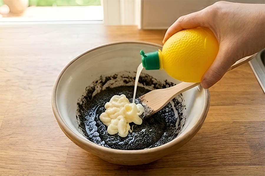 ➋ 검은깨에 마요네즈, 꿀, 레몬즙 넣고 섞기