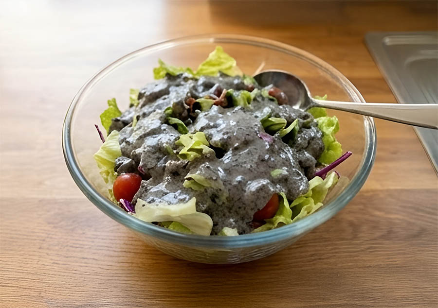➎ 샐러드 위에 흑임자 드레싱 뿌리기