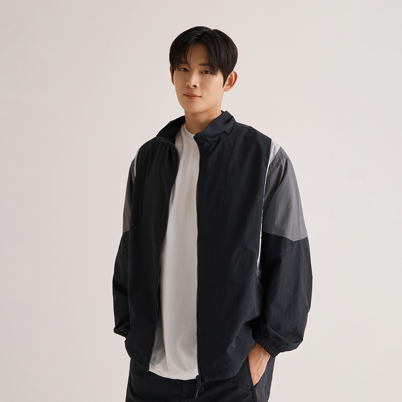 리찬님이 선보인 두 번째 스타일은 바로 '고프코어 룩'이에요. 고프코어는 아웃도어에 최적화된 기능성 의류를 평소 입는 일상복과 믹스 매치하여 입는 스타일인데요! 그래놀라 룩이 자연친화적인 무드가 강했다면, 고프코어 룩은 보다 현대적인 느낌을 내는 것이 포인트죠! 리찬님은 아노락 패딩을 고프코어 룩에 활용해 도시적인 감각을 살렸어요. 하의로는 그레이 컬러의 트랙 팬츠, 이너에는 후드티와 스웨트 셔츠의 레이어드로 현대적인 느낌을 살렸죠. 핵심은 아노락 패딩과 트랙 팬츠의 조화로 질감의 통일성을 살린 것이에요!