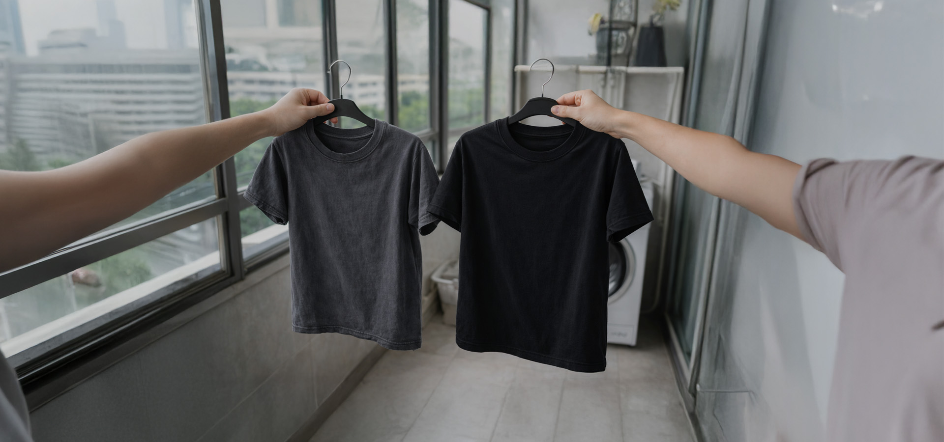 검정 옷이 바랜 것처럼 보이는 건 단순히 색이 빠져서 그런 것이 아닙니다. 잦은 세탁과 탈수로 섬유 결이 흐트러지면서 표면이 거칠어지고, 빛이 사방으로 퍼지기 때문입니다.