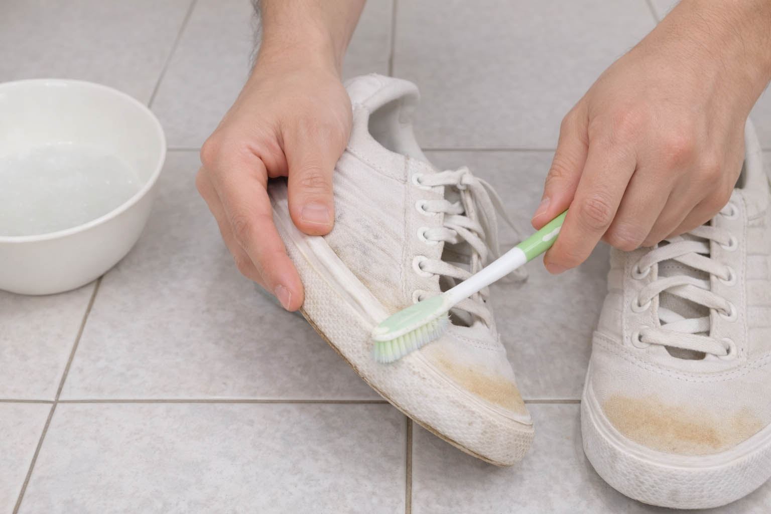 운동화의 밑창과 고무 부분에 때가 끼면 신발 전체가 더 누렇게 보일 수 있습니다. 치약, 베이킹소다, 주방세제를 1:1:1 비율로 섞어 칫솔에 묻힌 뒤 밑창을 문질러 주세요. 치약의 연마 성분과 베이킹소다의 세정력이 묵은때를 제거해 밑창이 다시 하얗게 살아납니다.