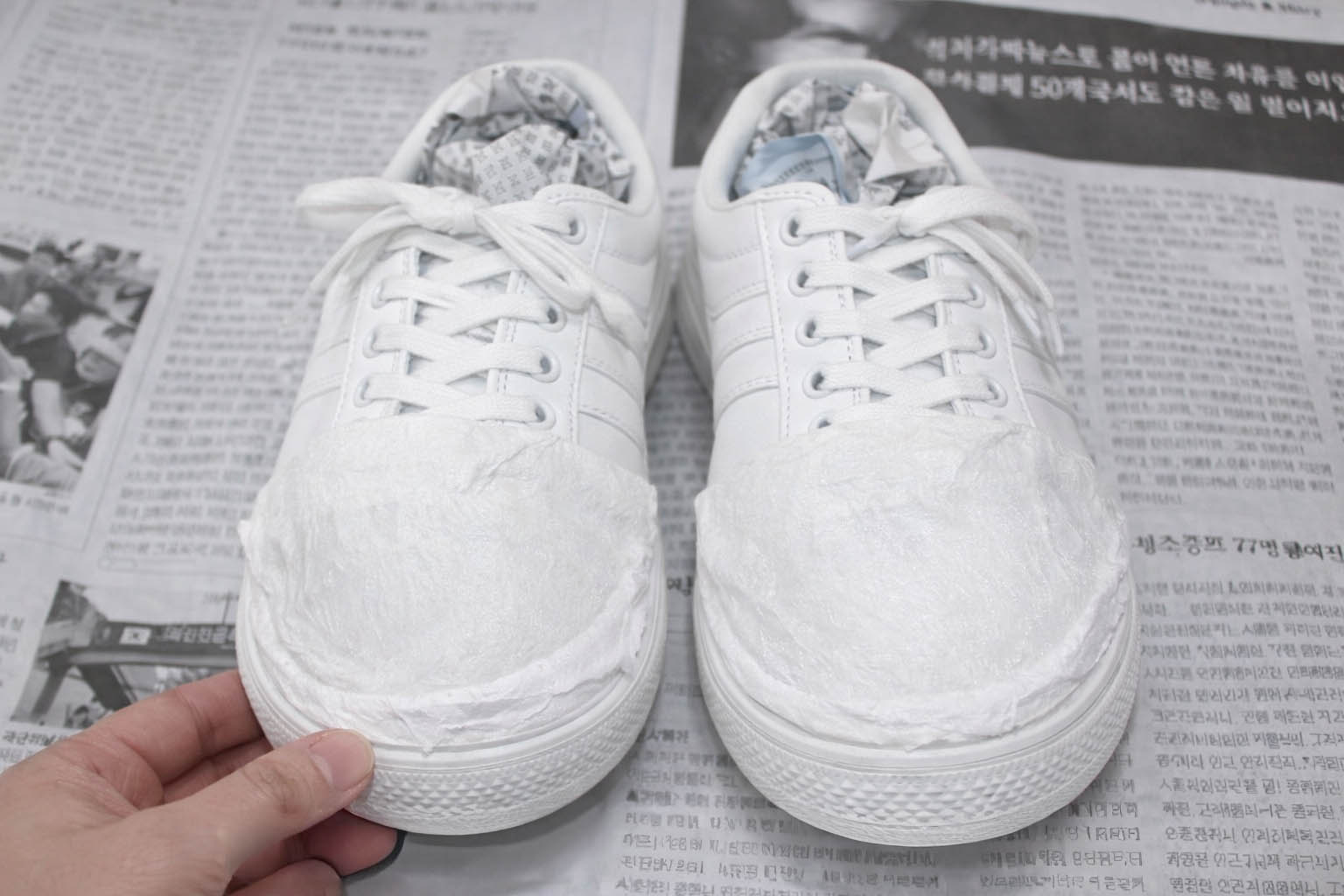 누렇게 변한 부분에 물을 살짝 묻힌 뒤 휴지를 밀착해서 올려주세요. 그리고 휴지 위에도 물을 살짝 뿌려 신발에 완전히 붙도록 합니다.