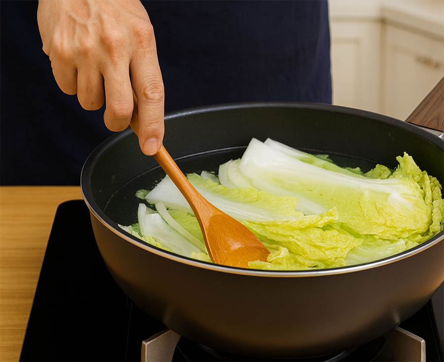 ➋ 끓는 물에 소금을 넣고, 배추 겉잎부터 데쳐주세요.