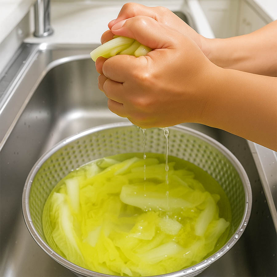 데친 배추를 바로 찬물에 헹궈주세요. 그다음 배추를 꽉 짜서 물기를 최대한 제거해 주세요.