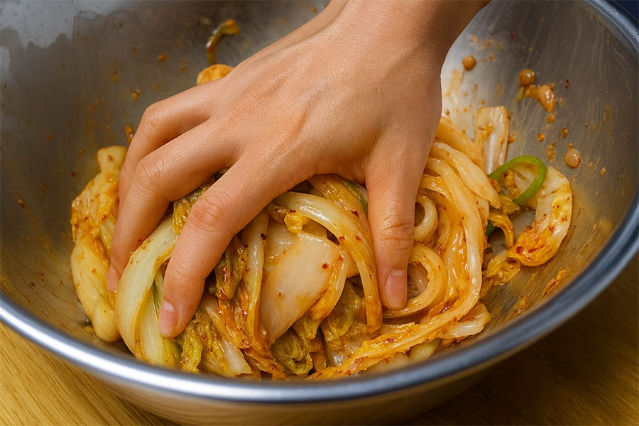 물기 짠 배추를 넣고 양념을 살살 섞어주세요. 너무 세게 비비면 배추가 물러지니 살살 버무려주세요.