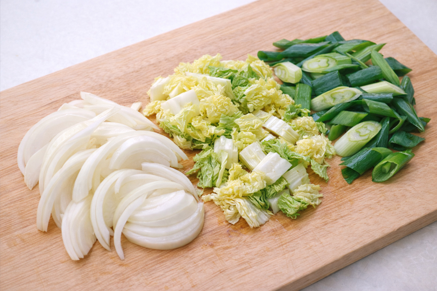 양파는 채 썰고 배추는 먹기 좋게 자릅니다. 대파는 어슷 썰어주세요. 배추 대신 양배추를 쓰면 단맛을 낼 수 있습니다.