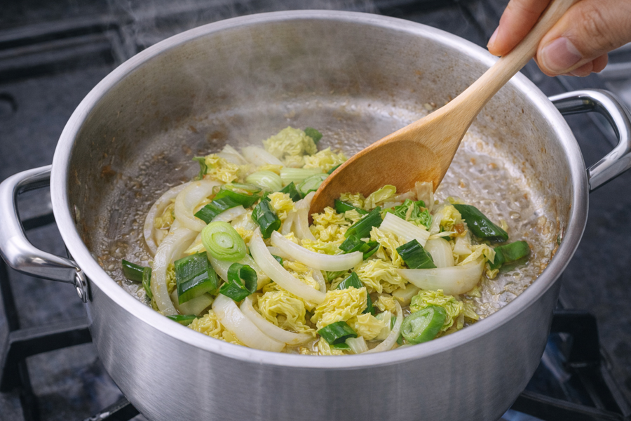 냄비에 식용유를 넉넉히 두르고 중강불에서 양파와 대파를 먼저 볶습니다. 향이 올라오면 배추를 넣고 숨이 죽을 때까지 볶아주세요.
