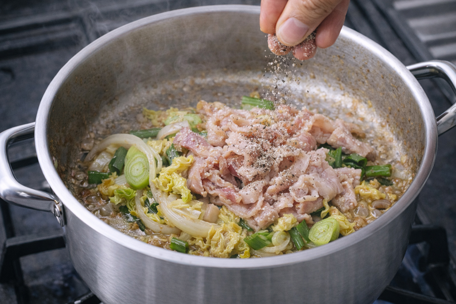 이 라면의 포인트는 '먼저 충분히 볶는다'입니다. 채소와 고기를 그냥 끓이는 게 아니라 기름에 볶아 풍미를 만든 뒤 물을 붓는 구조입니다. 이 차이 하나로 국물의 깊이가 달라집니다.
