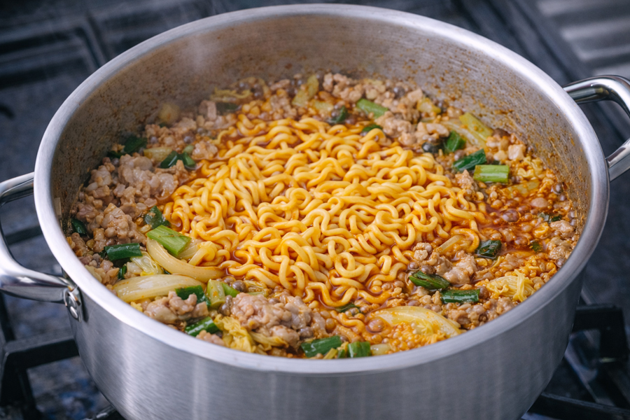 ➎ 물과 라면 넣고 끓이기
