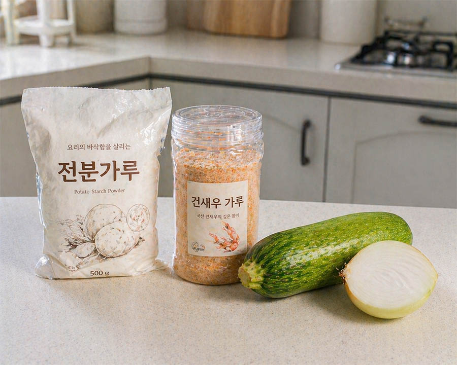 ◾ 준비물│애호박 1개, 양파 1/2개, 건새우 가루, 전분가루