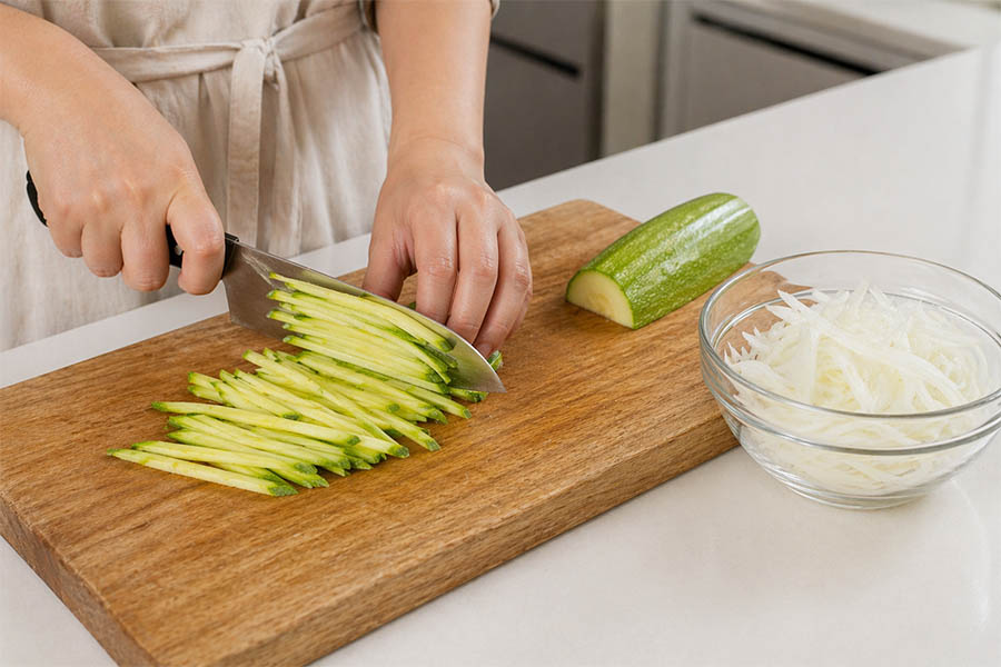 애호박과 양파를 최대한 얇게 채를 썰어주세요. 애호박을 얇게 썰어야 애호박끼리 서로 붙어서 밀가루 없이도 전이 찢어지지 않습니다.