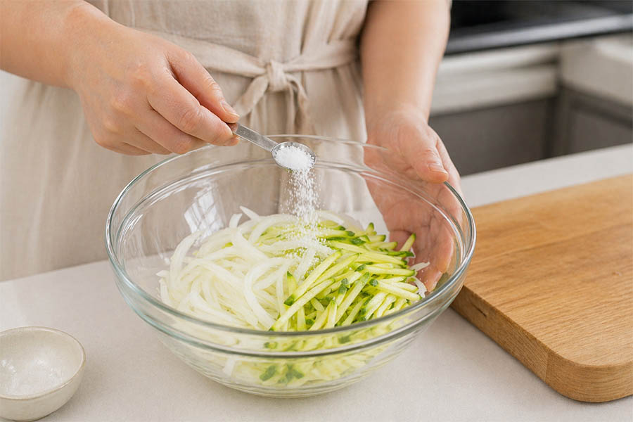얇게 채를 썬 애호박과 양파를 볼에 넣고 소금 1작은술 넣어주세요. 그리고 10분 동안 재워두세요. 이 과정에서 자연스럽게 수분이 나오기 때문에 물을 따로 넣을 필요가 없습니다.