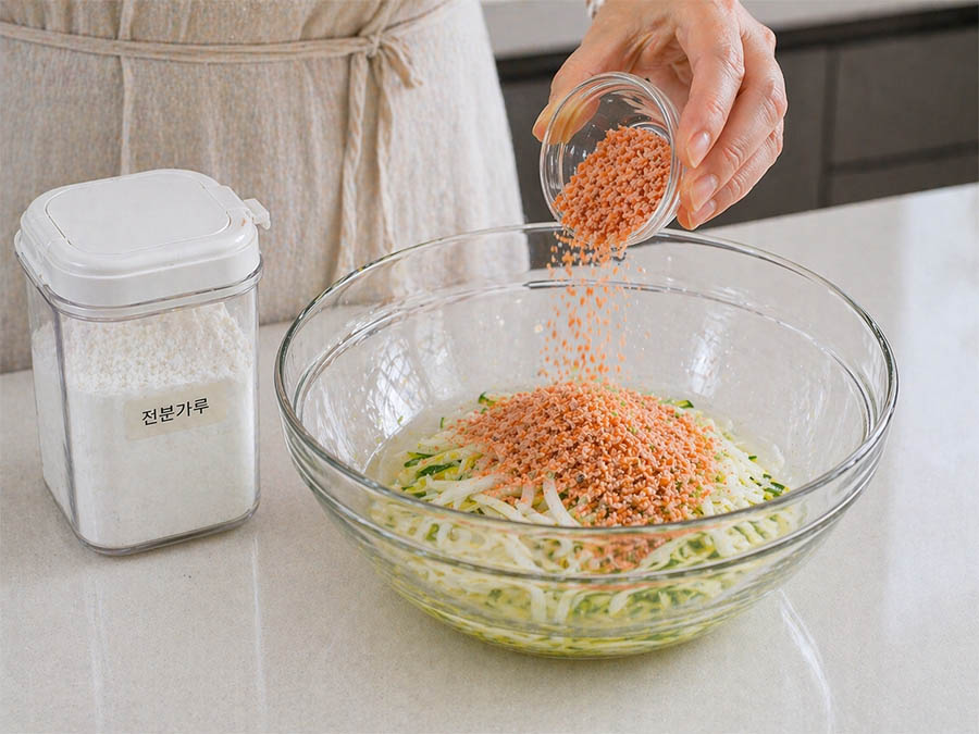 10분 동안 재워둔 애호박과 양파에 건새우 가루 2스푼과 전분 가루 3스푼을 넣어주세요. 건새우 가루는 전을 바삭하게 만들고, 전분 가루는 전의 쫀득한 식감을 만들어줍니다.