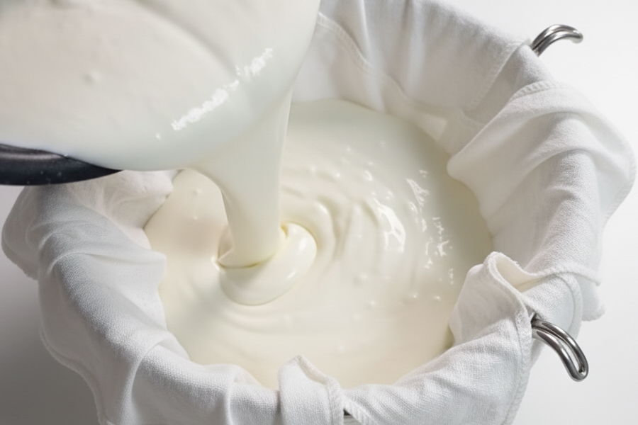 체망 위에 면포를 깔고, 만들어진 요거트를 넉넉히 부어 주세요. 아래로 수분이 빠지도록 받쳐 둔 뒤, 윗부분을 덮어 냉장고에 넣어 둡니다. 시간이 지나면서 점점 더 진하고 꾸덕한 질감이 만들어집니다.