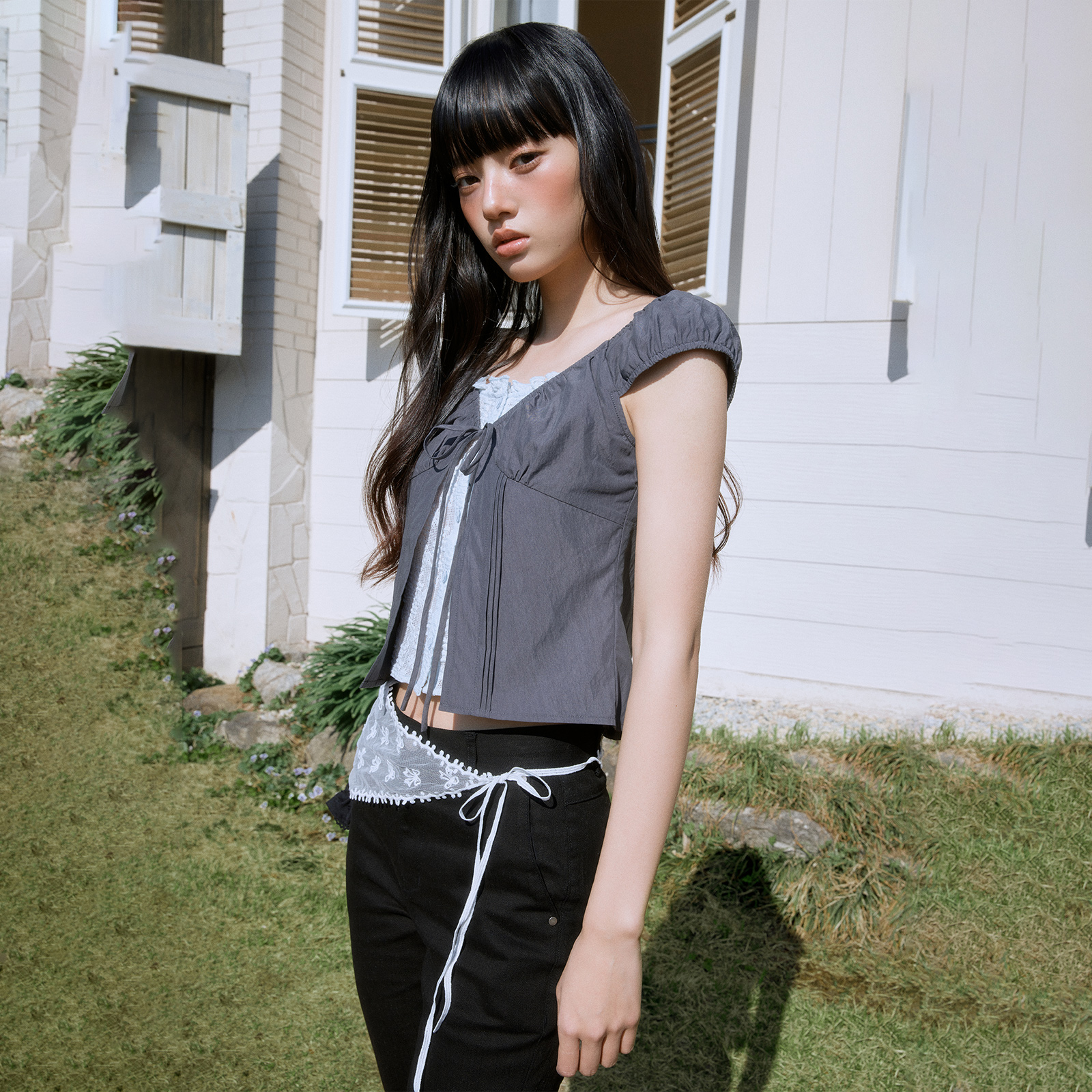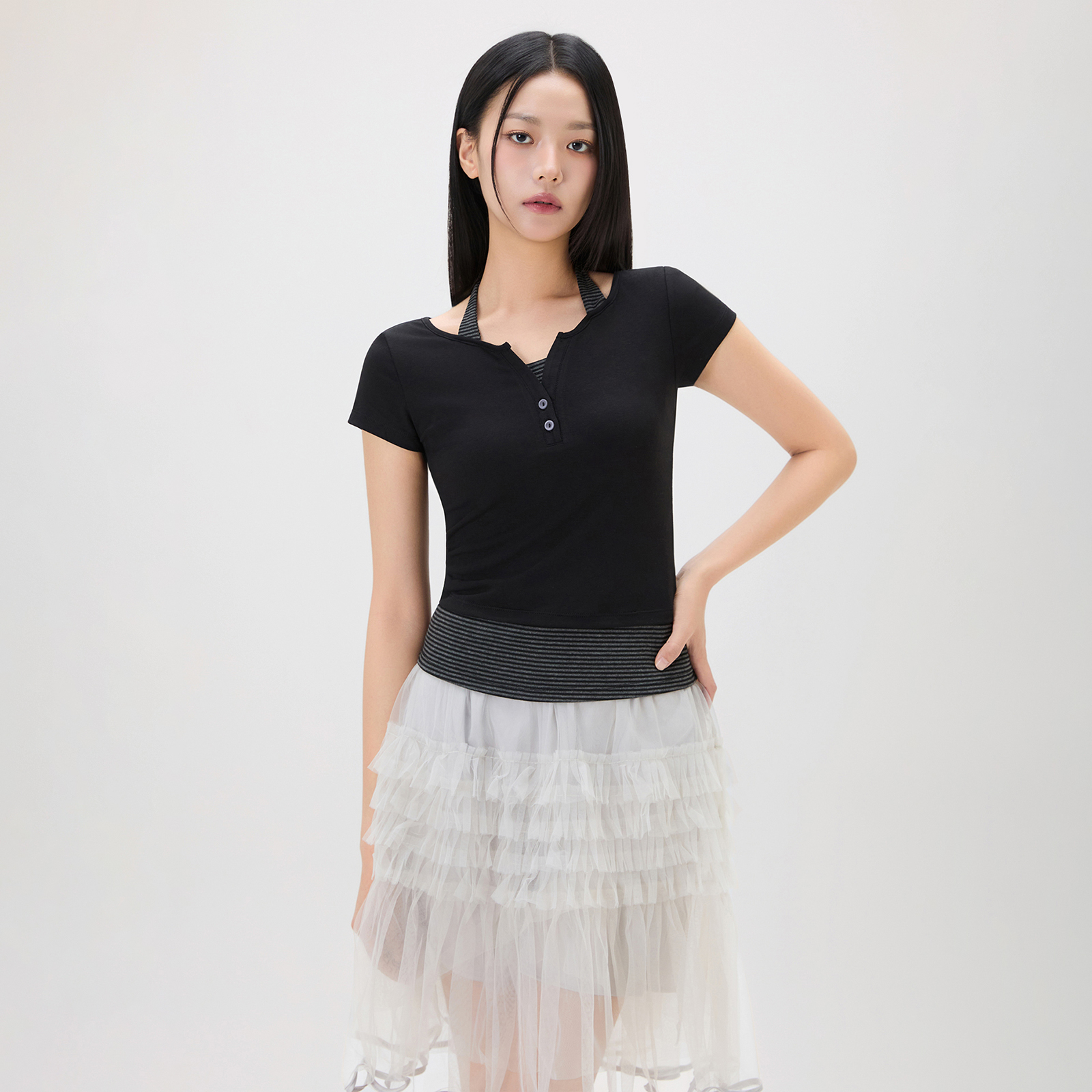 윤선님은 크롭한 기장의 화이트 이너와 매치해 스커트 패턴과 실루엣이 자연스럽게 돋보이도록 코디했어요. 언발란스한 기장으로 걸어갈 때 스커트 라인이 흐르는 듯 일렁이며 더 예뻐보이는 제품이랍니다.