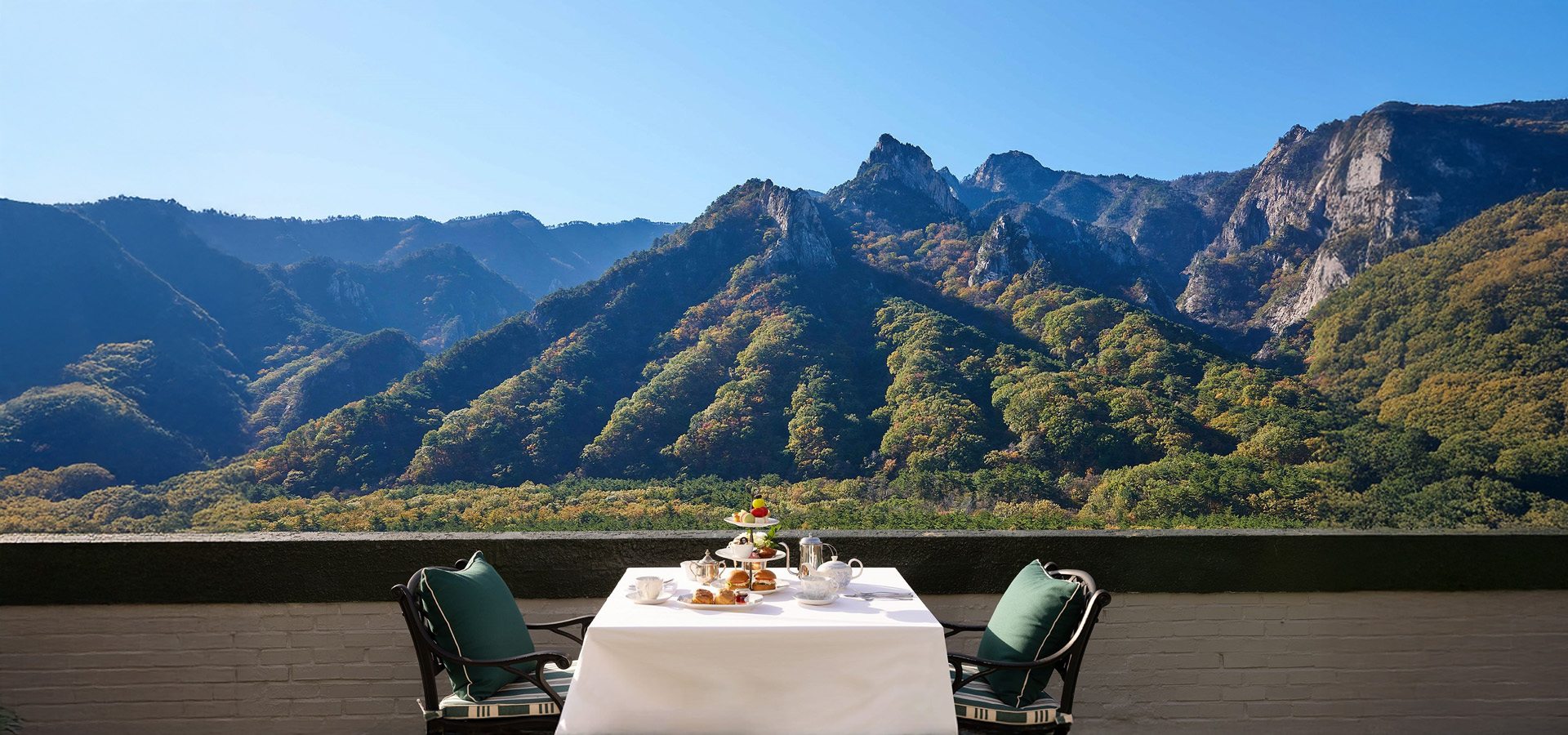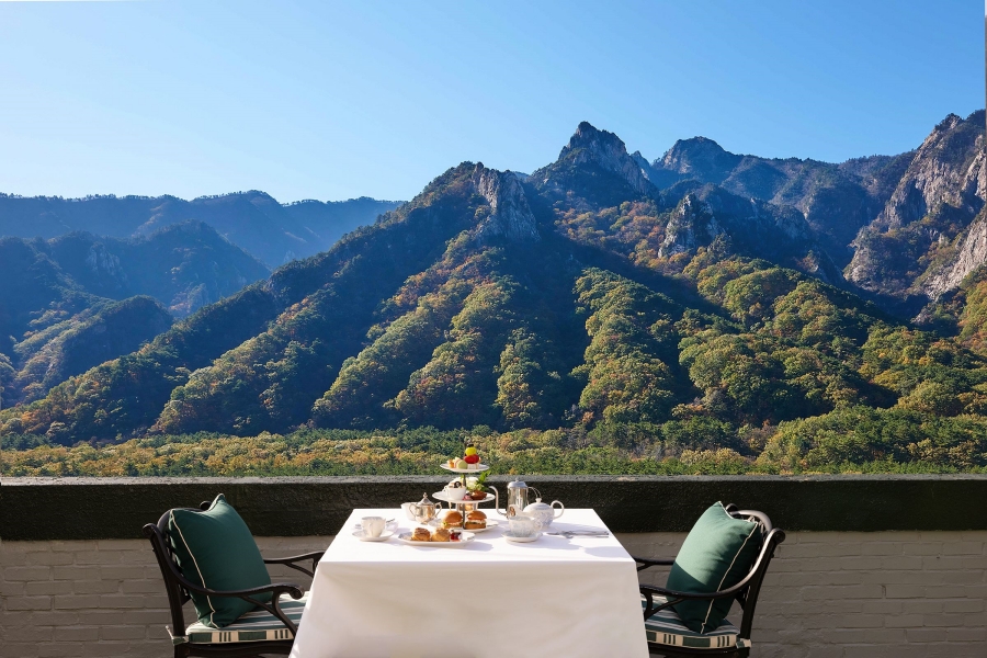 켄싱턴호텔 설악은 설악산국립공원까지 걸어서 5분 거리예요. 짐을 풀자마자 산 초입으로 걸어 나갈 수 있는 거리죠. 객실과 레스토랑에서 설악산 파노라마 뷰가 펼쳐지고, 권금성에 오르면 공룡능선과 울산바위가 겹겹이 쌓인 풍경이 한눈에 들어와요. 설악의 풍경은 부드럽게 흐르기보다 또렷하게 솟아올라요. 칼처럼 선 기암절벽과 그 사이를 가르는 폭포, 계곡이 어우러져 산의 결을 만들어내죠. 그런 거친 자연과 묘하게 어울리는 게 이 호텔의 영국식 클래식 무드예요. 비틀즈 관련 소장품이 전시된 애비로드 라운지와 왕실 테마 레스토랑까지, 그래서 이곳을 '설악 속 작은 영국'이라고 부르는 거예요.